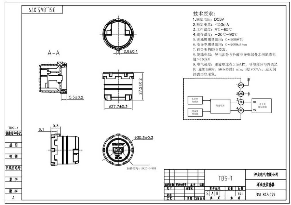 TBS - 1 cleanliness is a turbidity sensor and conductivity sensor of cleanliness, and general household sensors difference, is that the water quality numerical using UART interface communication, is a digital home cleanliness of the structure of sensor. The design of the sensing surface of the plane can reduce the contamination and attach to the sensing surface more effectively, so that the product performance is more stable and the service life is longer.